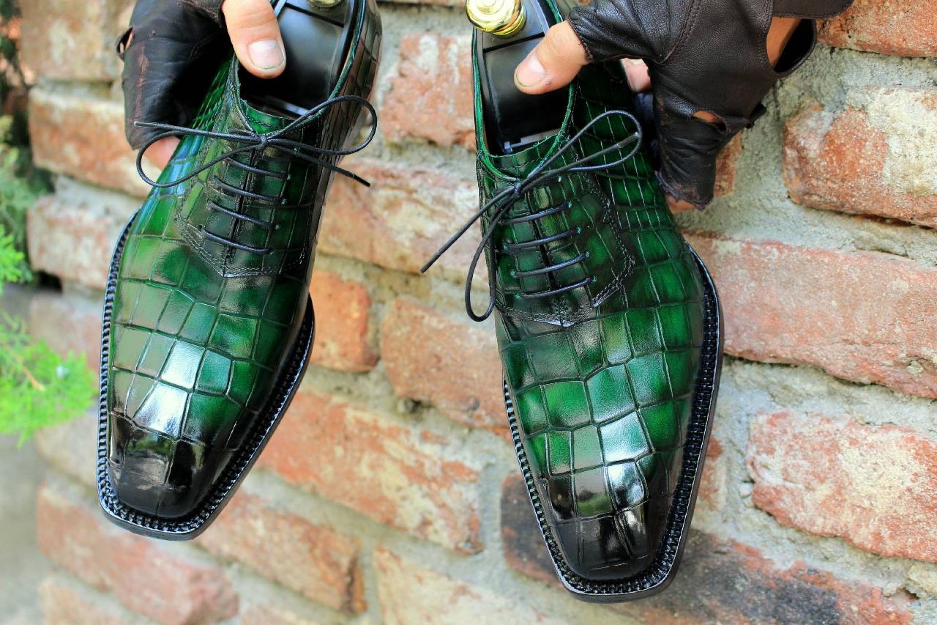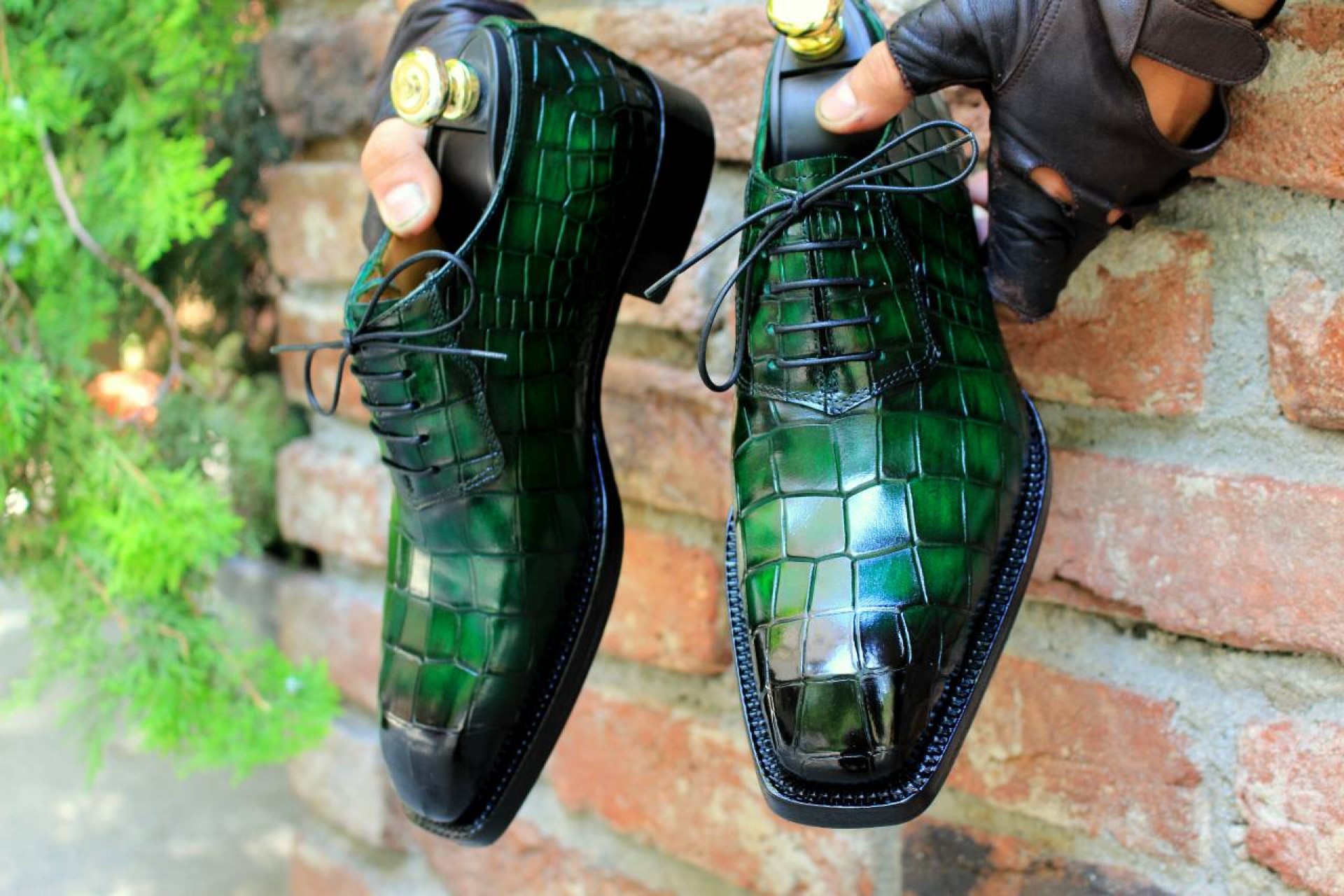 Model 2.1 Croc Ocean green 3 are Handcrafed patina men shoes built from calf leather, having a leather sole of 6mm blake welted.Delivery time 3-4 weeks.